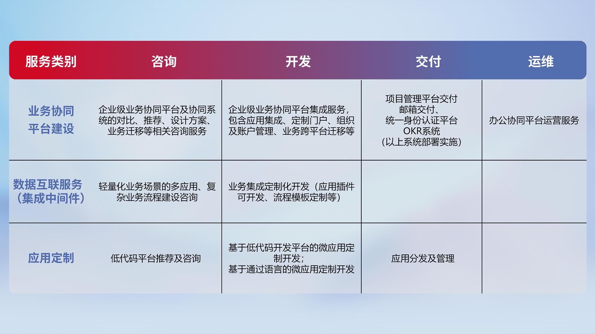 针对钉钉、、企微、、、IDaas等平台级产品提供产品的规划、、、、方案、、、、交付、、定制化开发等服务,,,,实现如统一协同办公、、、智能客户服务、、、、混合会议管理、、、、智能数据查询、、等业务场景,,,实现数字化转型。。。
