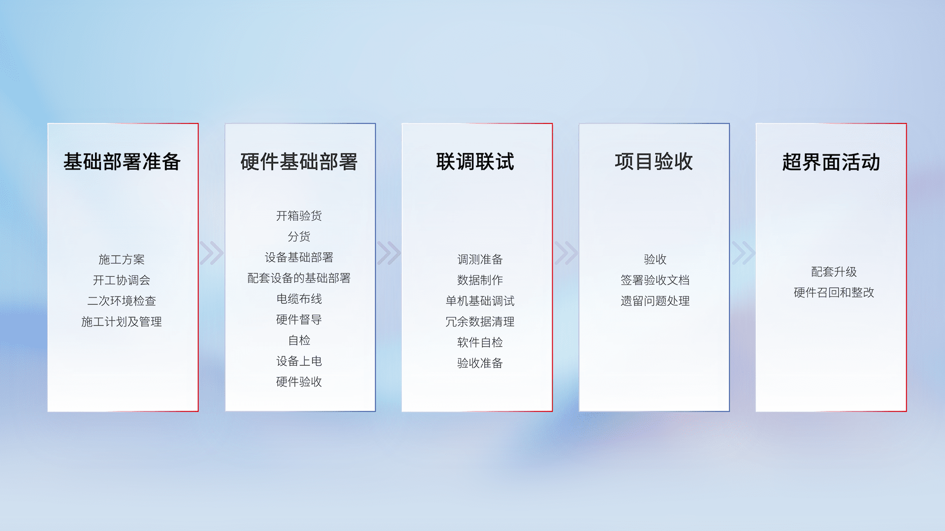 从基础部署准备、、、硬件基础部署、、、、联调联试、、、、项目验收、、、、越界面活动的全过程可追溯,,保证施工质量和进度。。。
